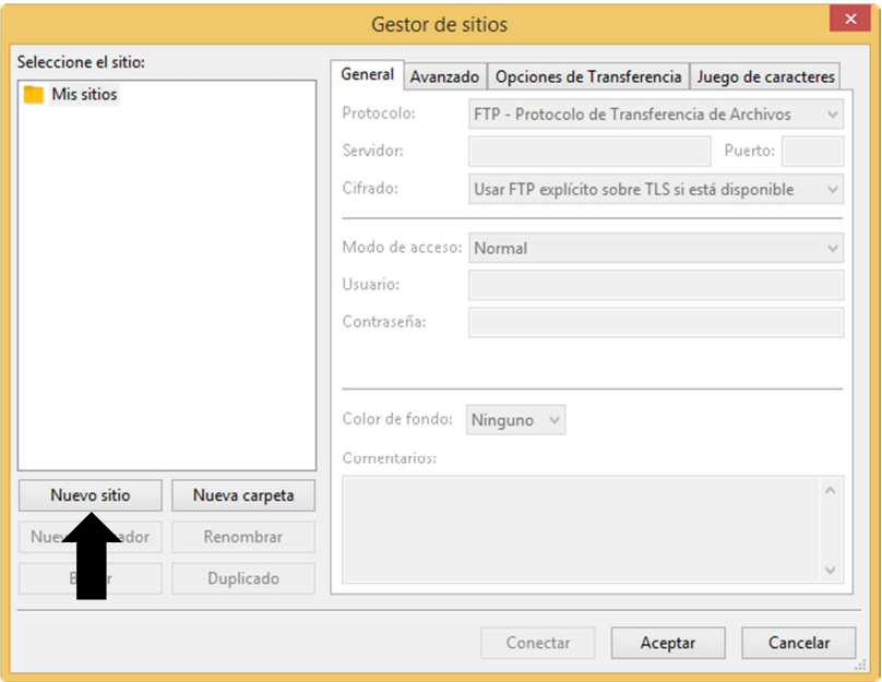 Dentro del Administrador de sitios, da clic en el botón Nuevo sitio. Esto generará un nuevo perfil para guardar los datos de tu conexión.