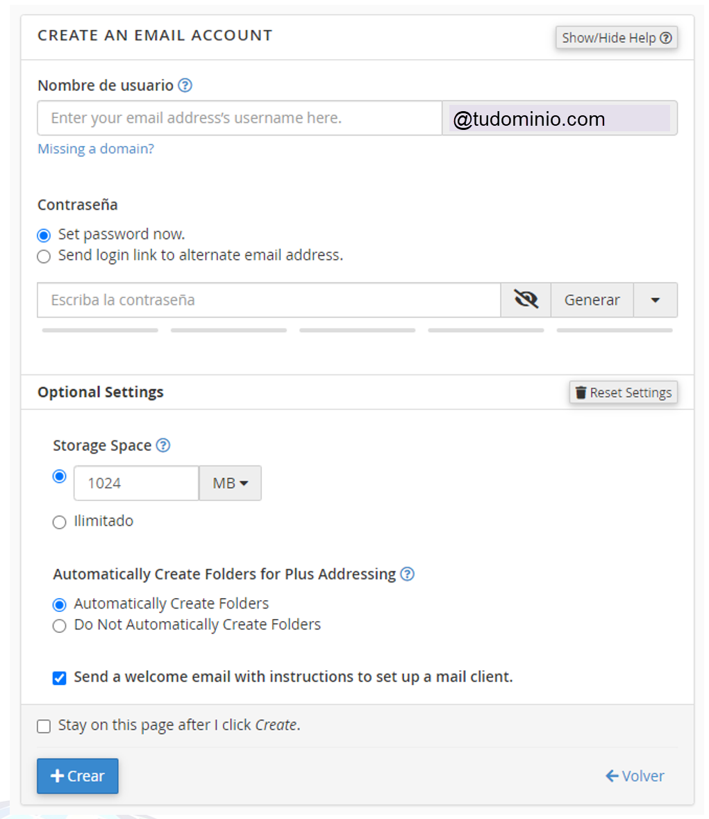 Revisa los detalles proporcionados y haz clic en "Crear" o "Create" para finalizar el proceso y crear la nueva cuenta de correo electrónico.