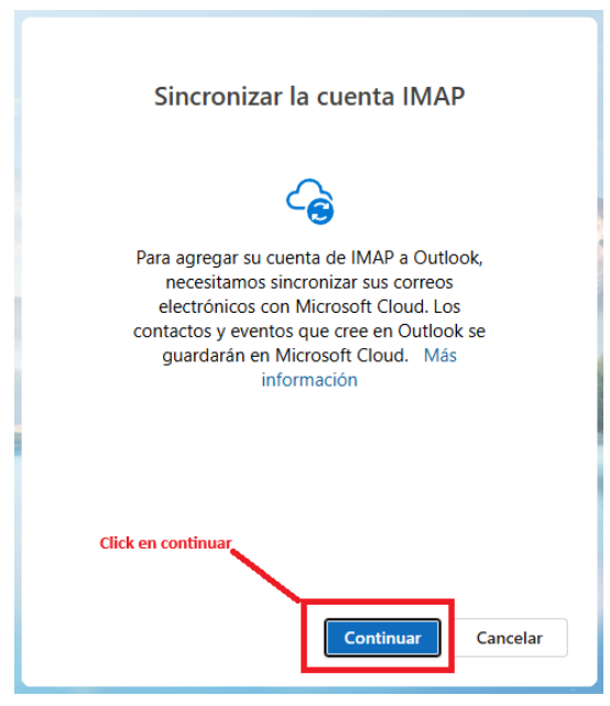 Una vez que hayas completado toda la configuración y presiones el botón ?Continuar?, Outlook te preguntará si deseas sincronizar la cuenta IMAP. Simplemente haz clic en ?Continuar? nuevamente.