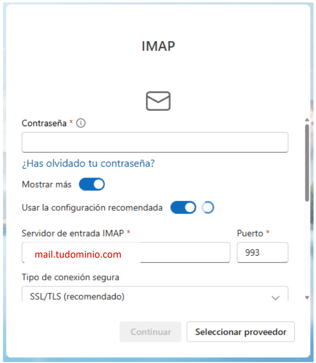 Una vez que ingreses la dirección de correo que deseas configurar, aparecerá una ventana como la siguiente.