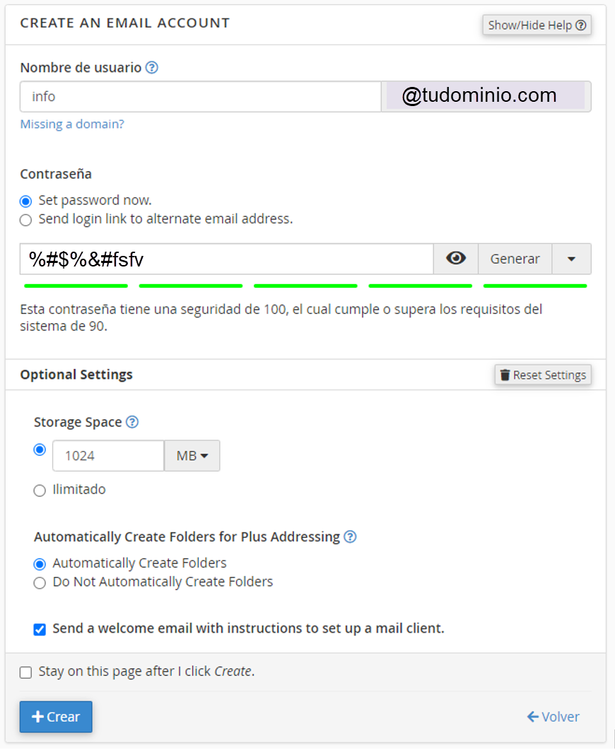 Revisa los detalles proporcionados y haz clic en "Crear" o "Create" para finalizar el proceso y crear la nueva cuenta de correo electrónico.